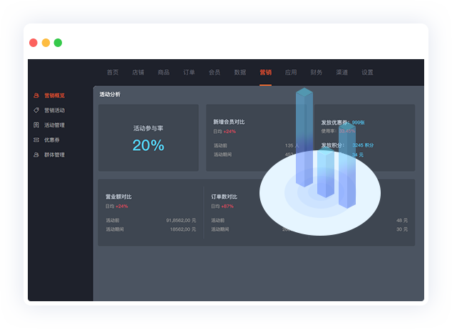 活动参与率、参与人数、奖励发放情况,活动前后会员、销额、订单对比分析一目了然,为您提供精细化用户运营数据基础,让您更加了解用户行为。