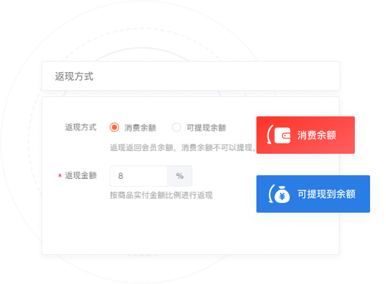 商家可以选择返现到可提现余额,或只能用于商城消费的消费余额。