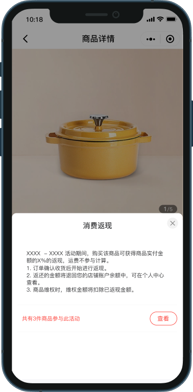 商家可指定部分商品的部分规格参与活动,并设置不同的返现比例。