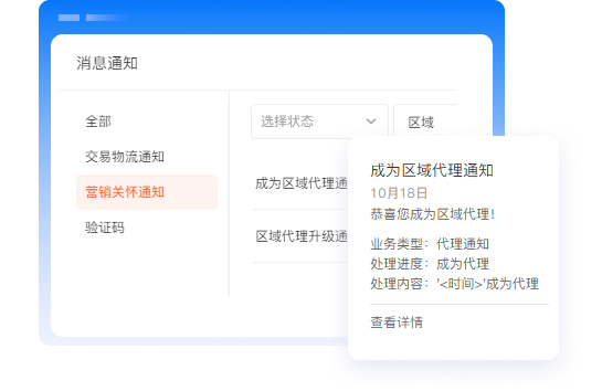 当后台发出成为代理、代理升级、分红入账、分红体现申请驳回、分红提现打款、代理撤销等通知时,会在微信模板或短信中收到消息。